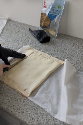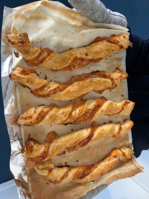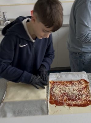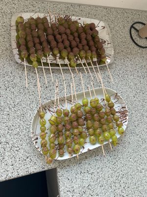Mit Handschuhen, Spießen, Teigrollen und jeder Menge guter Laune ging es hochkonzentriert ans Werk: Trauben wurden kunstvoll aufgespießt und mit Schokolade veredelt, Blätterteigstreifen mit Tomatensauce und Käse gefüllt, gedreht, gebacken und stolz präsentiert.